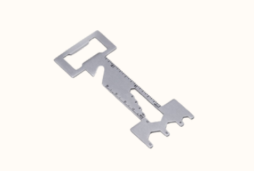Abridor de garrafas metálico multiferramentas, possui réguas com unidades em centímetros e polegadas, 5chaves de boca, 3 chaves hexagonais e faca de cordão.
