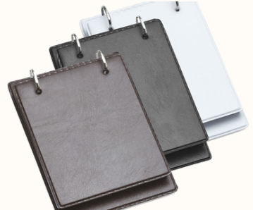 Bloco de anotação de mesa com trilho de ferro, material couro sintético.