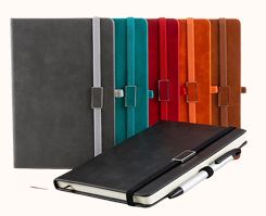 Caderneta emborrachada com suporte para caneta 96 folhas. 21,4cm x 14,7cm x 2,3 cm