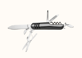 Possui: lâmina de corte, mini tesoura, abridor de lata, abridor de garrafa, chave phillips, lixa e saca-rolhas.