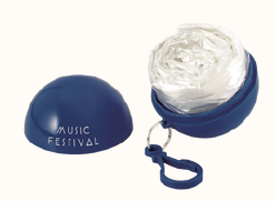 Capa de chuva de tamanho único, fornecida dentro de embalagem em formato de bola, com chaveiro e mosquetão.