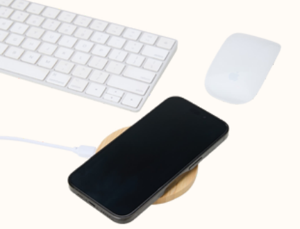 Carregador via indução formato disco com indicador de funcionamento em LED, feito em Bambu.