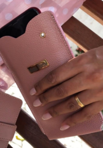 Carteira em couro para celular com detalhe externo de ponto de luz.