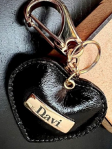Chaveiro em couro com formato de coração. Personalização a laser.