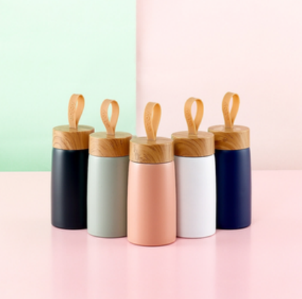 Contém tampa plástica com design de bambu e alça de silicone para transporte.