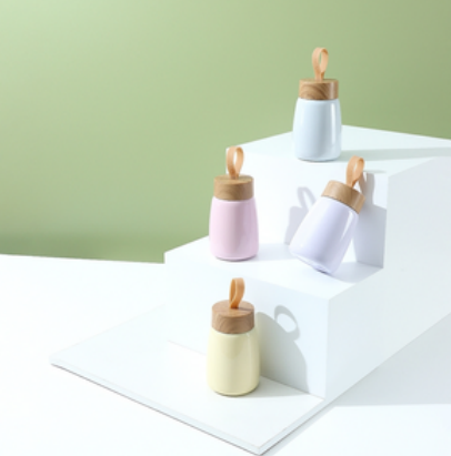 Contém tampa plástica com design de bambu e alça de silicone para transporte.