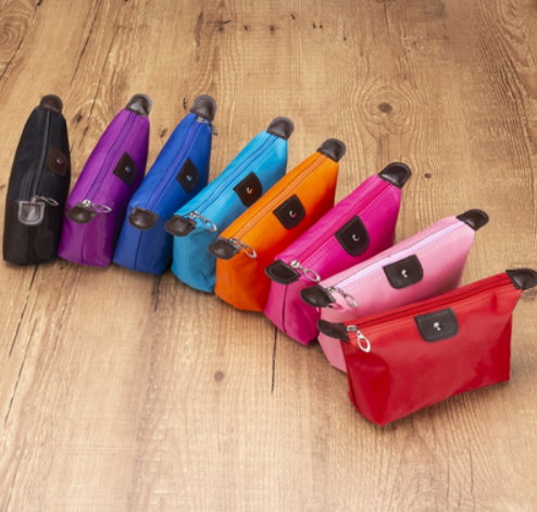 Necessaire impermeável de poliéster com detalhes em couro sintético e parte interna com revestimento emborrachado, possui um “botão” no detalhe do couro frontal.