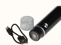 Aparador de barba elétrico recarregável. Possui status da bateria visível e botão antiderrapante para uma maior aderência ao toque. Acompanha cabo USB Tipo-C, escovinha para limpeza e tampa protetora.
