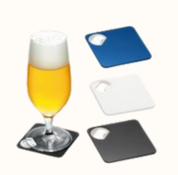 Porta copos em ABS com abridor de garrafas e esponja antiderrapante na base.